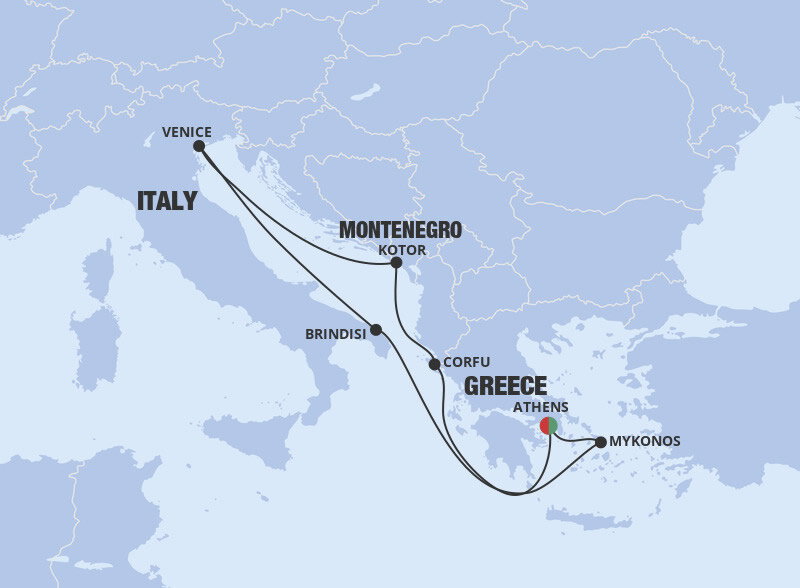 The lush and verdant island of Corfu lies in the Ionian Sea, midway between Greece and Italy. It is an island of sparkling beaches, mountains splashed with wildflowers, and historical, perched fortresses. Ships will dock at the town of Corfu.