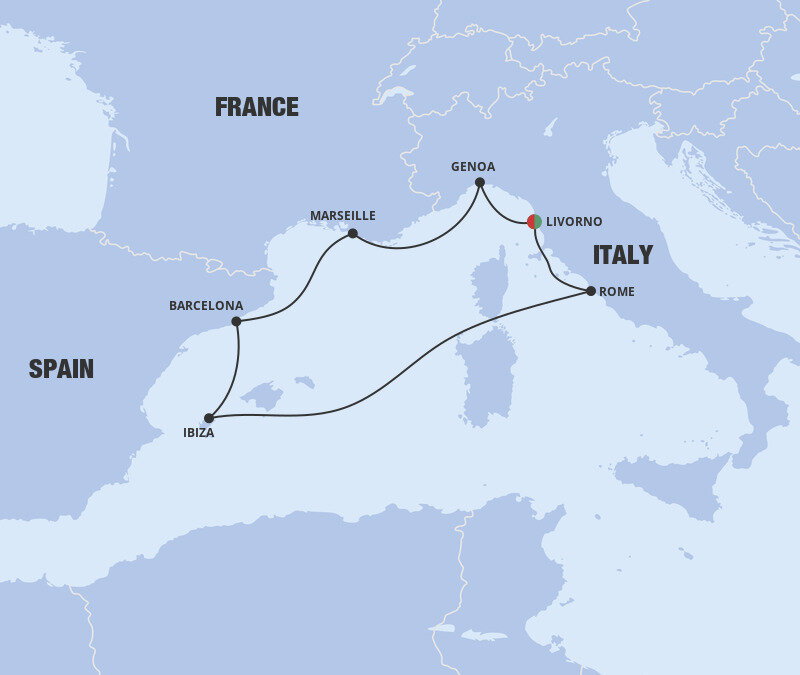 Cruise ships docking in Livorno typically use the Porto di Livorno, which is located approximately 13 kilometers (8 miles) from the historic city center of Pisa, and about 95 kilometers (59 miles) from Florence, requiring a 1.5-hour journey by coach.
