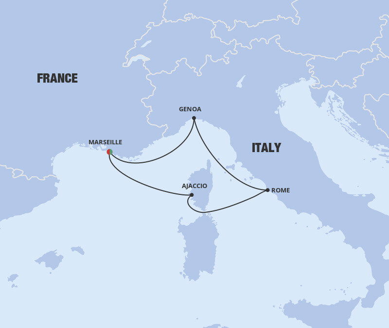 Located on the west coast of Corsica, Ajaccio is surrounded by green-hued mountains, with shady palm fringed squares and pleasure boats bobbing in the bay. The city is best known as the birthplace of Napoleon Bonaparte and his legacy dominates the city in its statues and street names. Ships will dock at Gare Maritime d’Ajaccio.