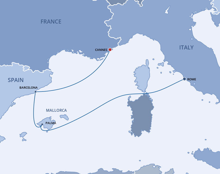 The quintessential Côte d'Azur resort town, Cannes has long been a playground for the rich and famous. Its epicentre is La Croisette, a boutique-lined boulevard with a legendary seven-mile beach. Ships will anchor offshore and tenders will be provided to the shore.