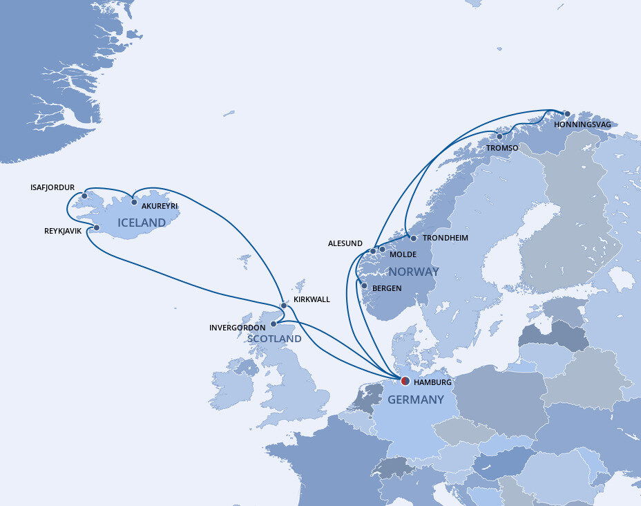 Iceland’s Capital of the North is the gateway to a thrilling land of roaring waterfalls, soaring volcanoes and glorious wildlife. Situated at the head of Eyjafjordur, Iceland's longest fjord and with a backdrop of dramatic snow-covered mountains, Akureyri is Iceland's second largest city. Ships will dock at the pier.