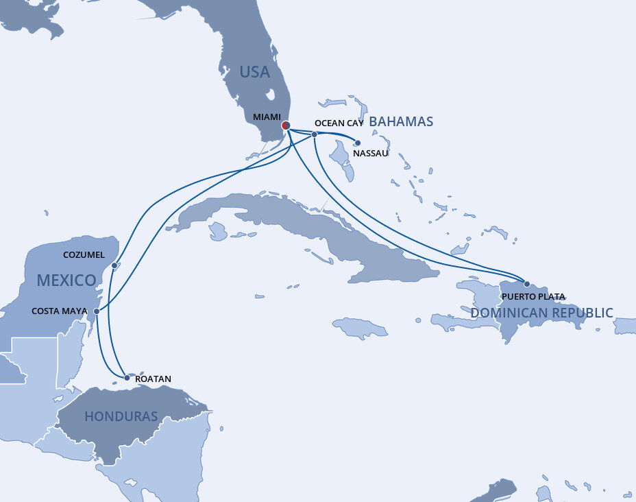 This multicultural city where the sun rules supreme is more than just a cruise port. Visitors from all over the world enjoy Miami’s famous Art Deco buildings, family-friendly zoos and romantic palm tree-lined streets filled with fantastic restaurants. Don’t forget about the white sandy beaches and year-round warm weather, perfect for relaxing before or after your Caribbean cruise from Miami.