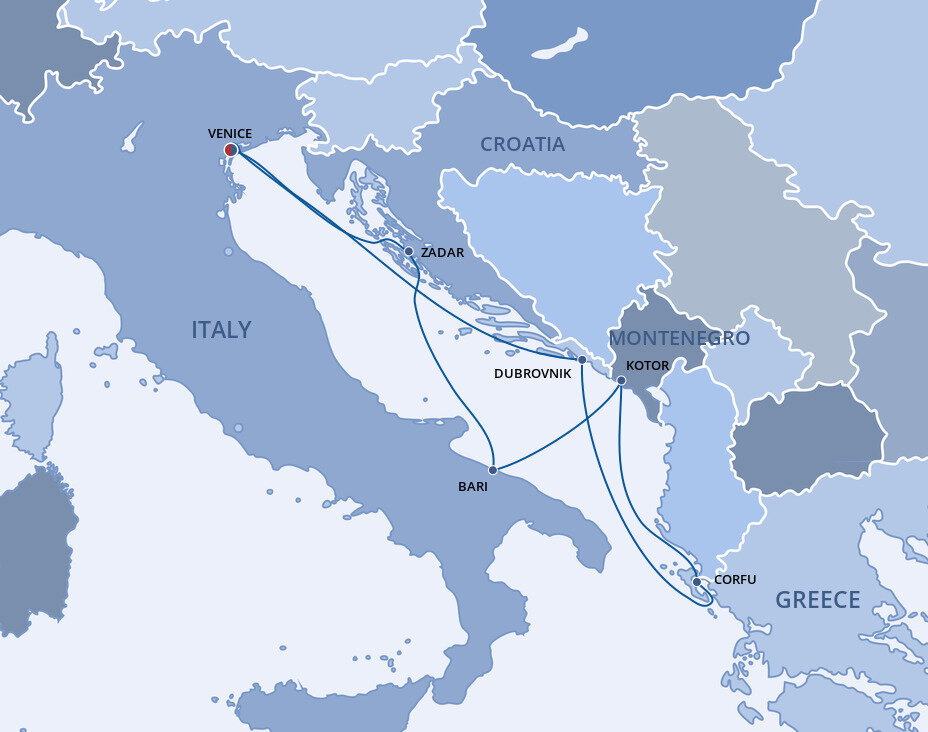 The lush and verdant island of Corfu lies in the Ionian Sea, midway between Greece and Italy. It is an island of sparkling beaches, mountains splashed with wildflowers, and historical, perched fortresses. Ships will dock at the town of Corfu.
