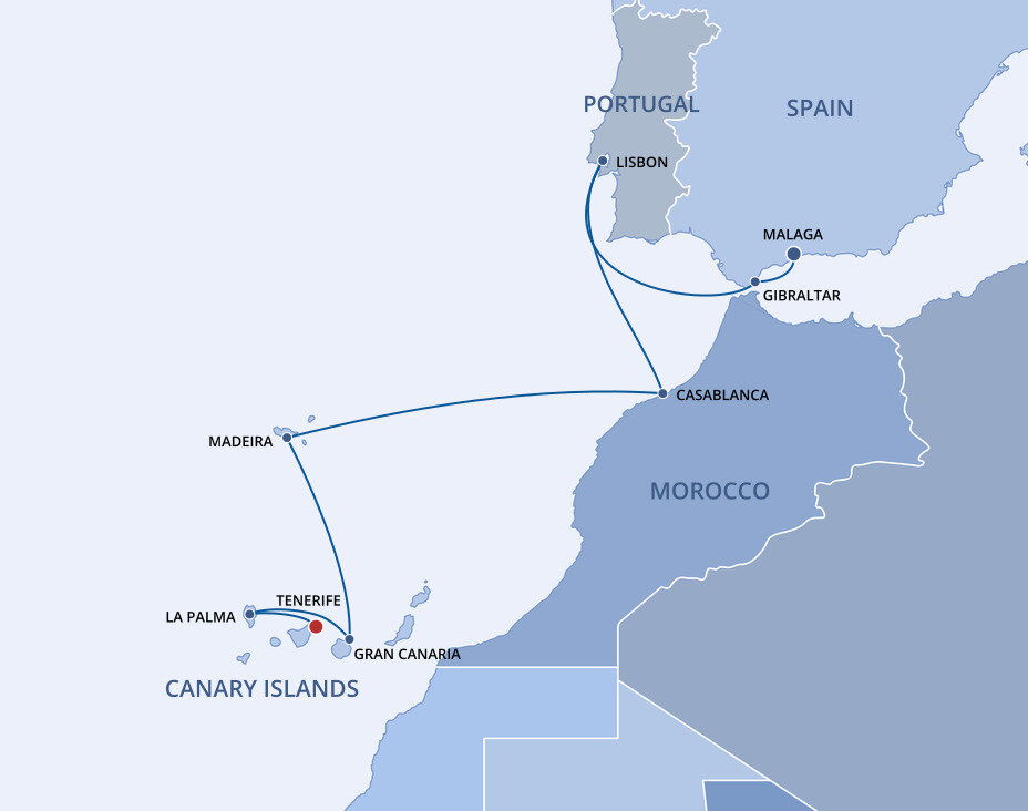 ‘La Isla Bonita,’ La Palma is one of the smaller of the Canary Islands. Its capital, Santa Cruz de la Palma, is a beautiful colonial-style city set on a picturesque harbour. The island’s landscape is one of black sand beaches, mountainous terrain and rich plant life. Ships will dock at the port of Santa Cruz de la Palma.