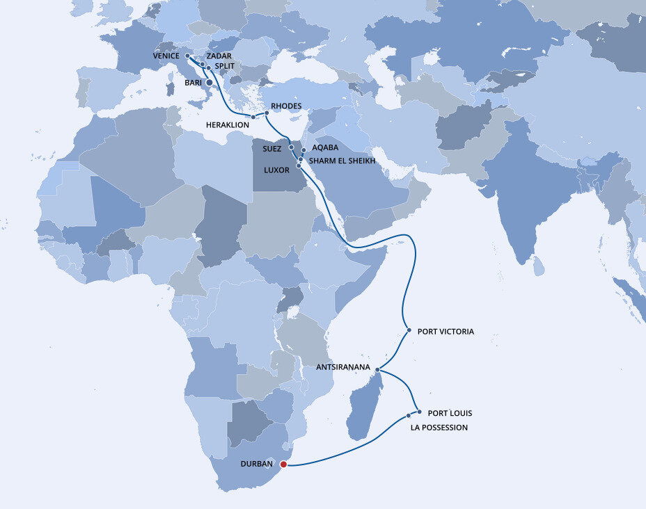 Enjoy the breathtaking illusion of sailing through oceans of desert sand as you cruise the Suez Canal, the engineering marvel that connects the Mediterranean and Red Seas.