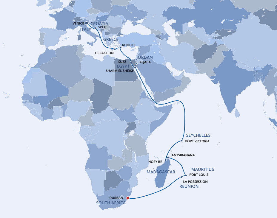British colonial architecture prevails in Durban, yet natural beauty is what characterises this charming city on the Indian Ocean. Durban delights the traveller with its colourful mosaic of ethnic neighbourhoods and memorable excursions to game reserves and the traditional lifestyle of the Zulu people. Ships will dock at the N-Shed Passenger Terminal.