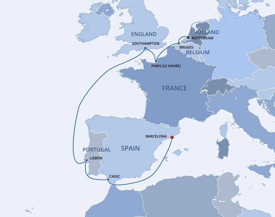 Your cruise finishes today in Barcelona, a captivating city on Spain's northeastern coast. If you're extending your stay in the city, start with a visit to La Sagrada Família, Antoni Gaudí's masterpiece, then wander through the narrow, historic streets of the Gothic Quarter.