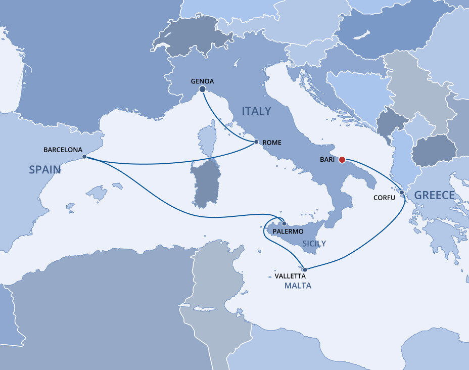 Perched on the Adriatic Sea, the city of Bari has long served as an important port city for both ancient and modern Italy. The city's Old Town beckons visitors to explore with its medieval churches, pedestrian-friendly plazas, and its labyrinth of crooked streets and passageways. Ships will dock at the Port of Bari.