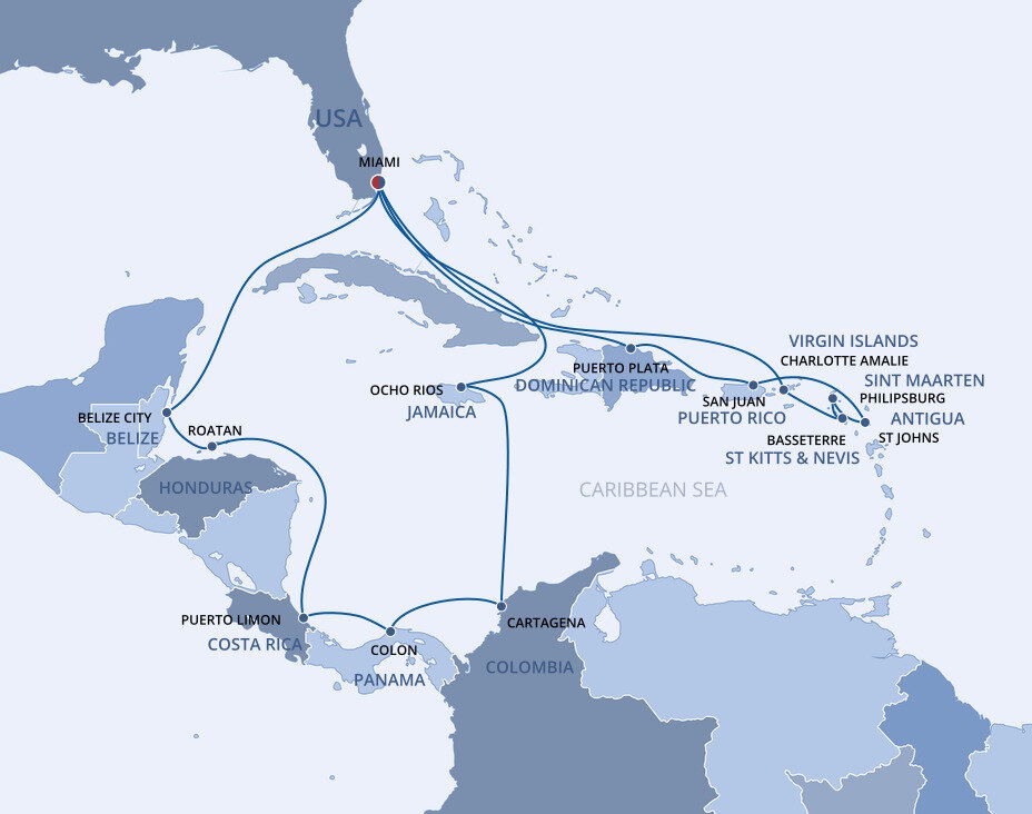 This multicultural city where the sun rules supreme is more than just a cruise port. Visitors from all over the world enjoy Miami’s famous Art Deco buildings, family-friendly zoos and romantic palm tree-lined streets filled with fantastic restaurants. Don’t forget about the white sandy beaches and year-round warm weather, perfect for relaxing before or after your Caribbean cruise from Miami.