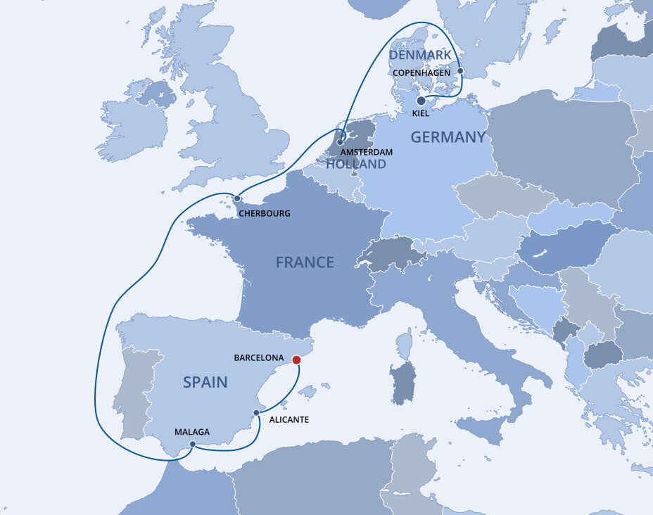 Your cruise finishes today in Barcelona, a captivating city on Spain's northeastern coast. If you're extending your stay in the city, start with a visit to La Sagrada Família, Antoni Gaudí's masterpiece, then wander through the narrow, historic streets of the Gothic Quarter.