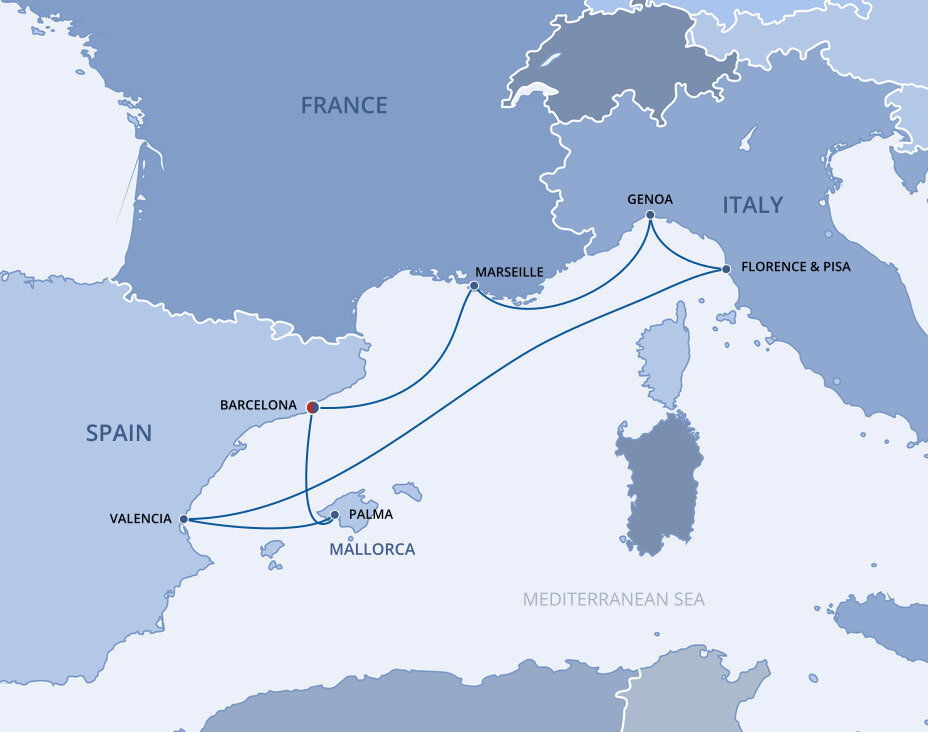 Your cruise finishes today in Barcelona, a captivating city on Spain's northeastern coast. If you're extending your stay in the city, start with a visit to La Sagrada Família, Antoni Gaudí's masterpiece, then wander through the narrow, historic streets of the Gothic Quarter.