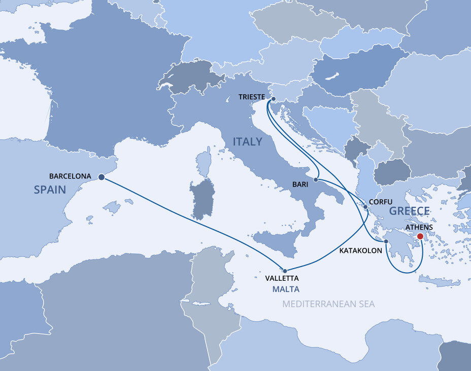 The lush and verdant island of Corfu lies in the Ionian Sea, midway between Greece and Italy. It is an island of sparkling beaches, mountains splashed with wildflowers, and historical, perched fortresses. Ships will dock at the town of Corfu.