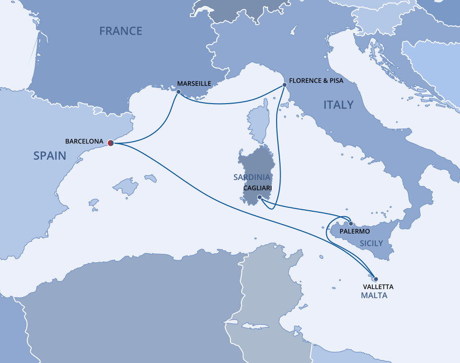 Cagliari, the capital of the island of Sardinia, is situated high upon hills that offer a panoramic view of the Golfo degli Angeli, the Gulf of Angels. Combining Byzantine churches with crumbling Roman ruins and Pisan towers, it’s an elegant, beguiling place to explore. Ships will dock at the Cagliari cruise port in Porto Cervo.