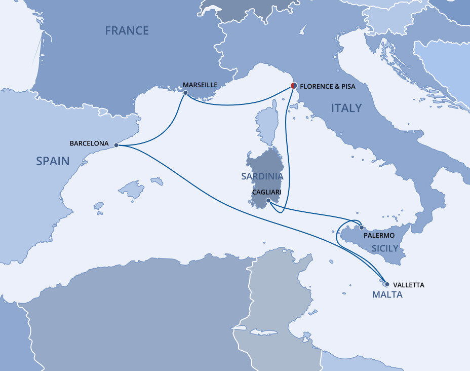 Cruise ships docking in Livorno typically use the Porto di Livorno, which is located approximately 13 kilometers (8 miles) from the historic city center of Pisa, and about 95 kilometers (59 miles) from Florence, requiring a 1.5-hour journey by coach.