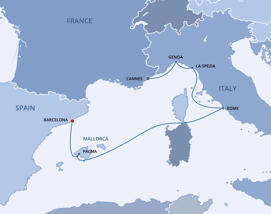 The quintessential Côte d'Azur resort town, Cannes has long been a playground for the rich and famous. Its epicentre is La Croisette, a boutique-lined boulevard with a legendary seven-mile beach. Ships will anchor offshore and tenders will be provided to the shore.