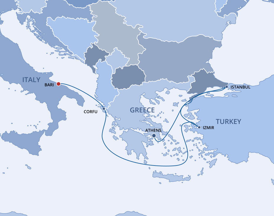 Perched on the Adriatic Sea, the city of Bari has long served as an important port city for both ancient and modern Italy. The city's Old Town beckons visitors to explore with its medieval churches, pedestrian-friendly plazas, and its labyrinth of crooked streets and passageways. Ships will dock at the Port of Bari.