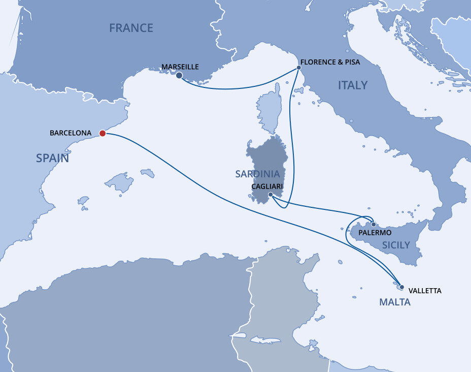 Cagliari, the capital of the island of Sardinia, is situated high upon hills that offer a panoramic view of the Golfo degli Angeli, the Gulf of Angels. Combining Byzantine churches with crumbling Roman ruins and Pisan towers, it’s an elegant, beguiling place to explore. Ships will dock at the Cagliari cruise port in Porto Cervo.