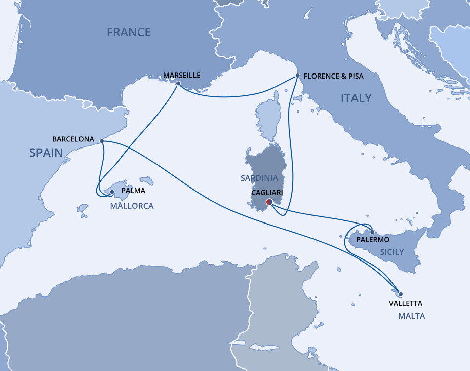 Cagliari, the capital of the island of Sardinia, is situated high upon hills that offer a panoramic view of the Golfo degli Angeli, the Gulf of Angels. Combining Byzantine churches with crumbling Roman ruins and Pisan towers, it’s an elegant, beguiling place to explore. Ships will dock at the Cagliari cruise port in Porto Cervo.
