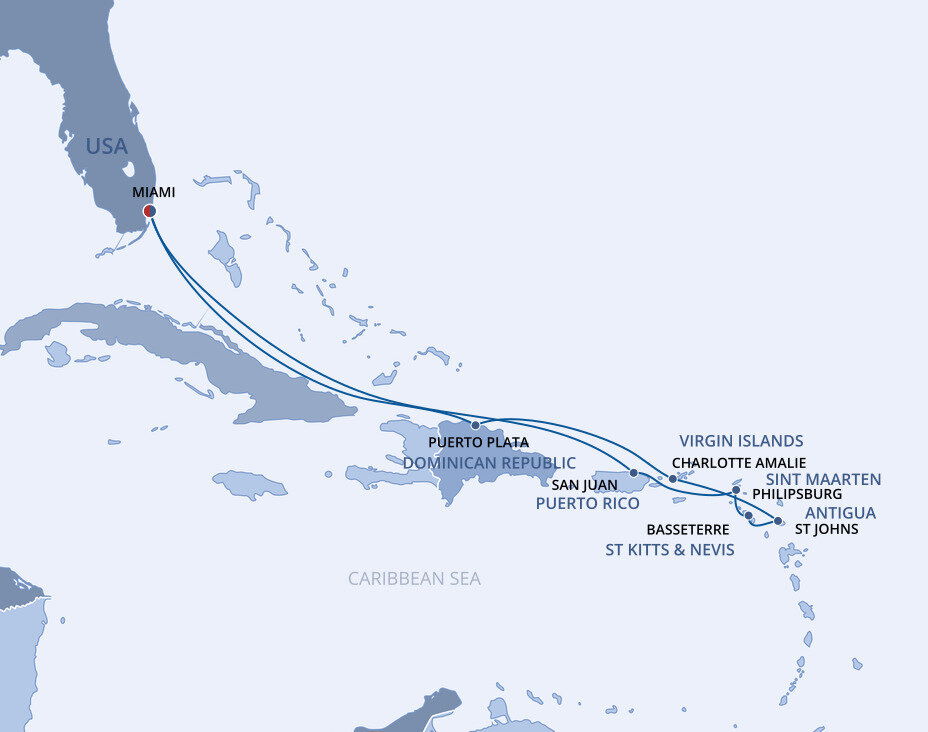 This multicultural city where the sun rules supreme is more than just a cruise port. Palm-lined causeways stretch across luminous Biscayne Bay as Miami rises in a gleam of glass towers, Art Deco curves, and tropical colour. Along Ocean Drive in South Beach, pastel facades from the 1930s glow beneath the Florida sun, while nearby Little Havana hums with domino parks, cigar shops, and the aroma of Cuban coffee. Beyond the shoreline, calm waters, yacht marinas, and breezy promenades frame a city shaped by Caribbean rhythms and sunlit coastal glamour.