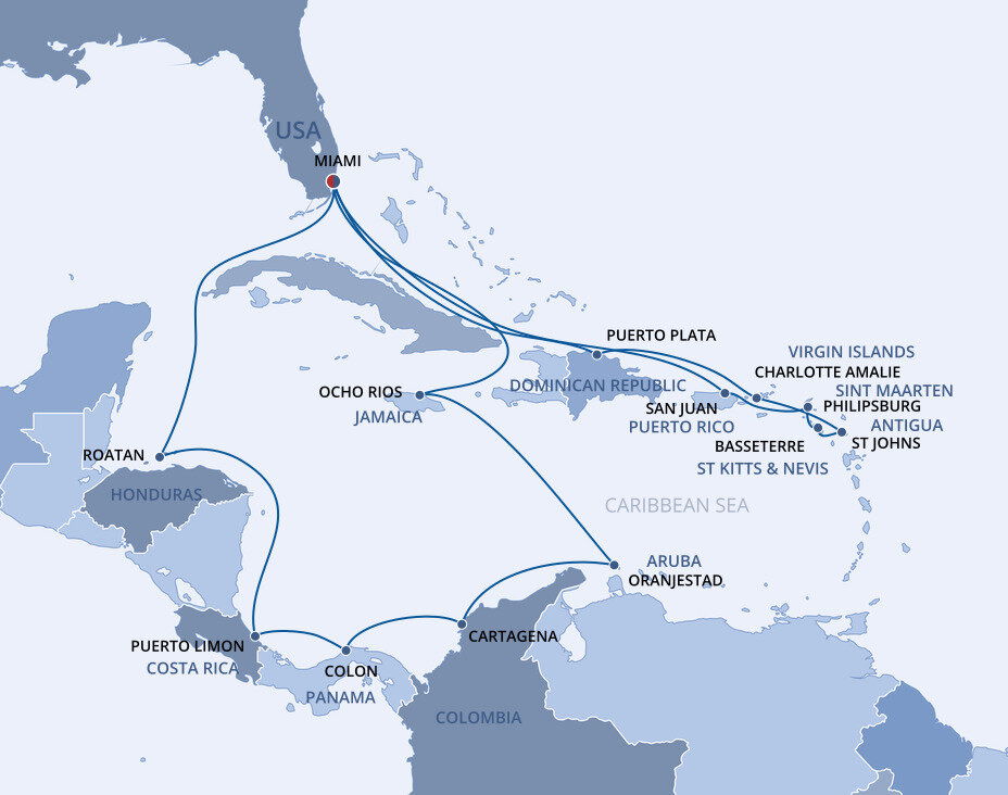 This multicultural city where the sun rules supreme is more than just a cruise port. Palm-lined causeways stretch across luminous Biscayne Bay as Miami rises in a gleam of glass towers, Art Deco curves, and tropical colour. Along Ocean Drive in South Beach, pastel facades from the 1930s glow beneath the Florida sun, while nearby Little Havana hums with domino parks, cigar shops, and the aroma of Cuban coffee. Beyond the shoreline, calm waters, yacht marinas, and breezy promenades frame a city shaped by Caribbean rhythms and sunlit coastal glamour.