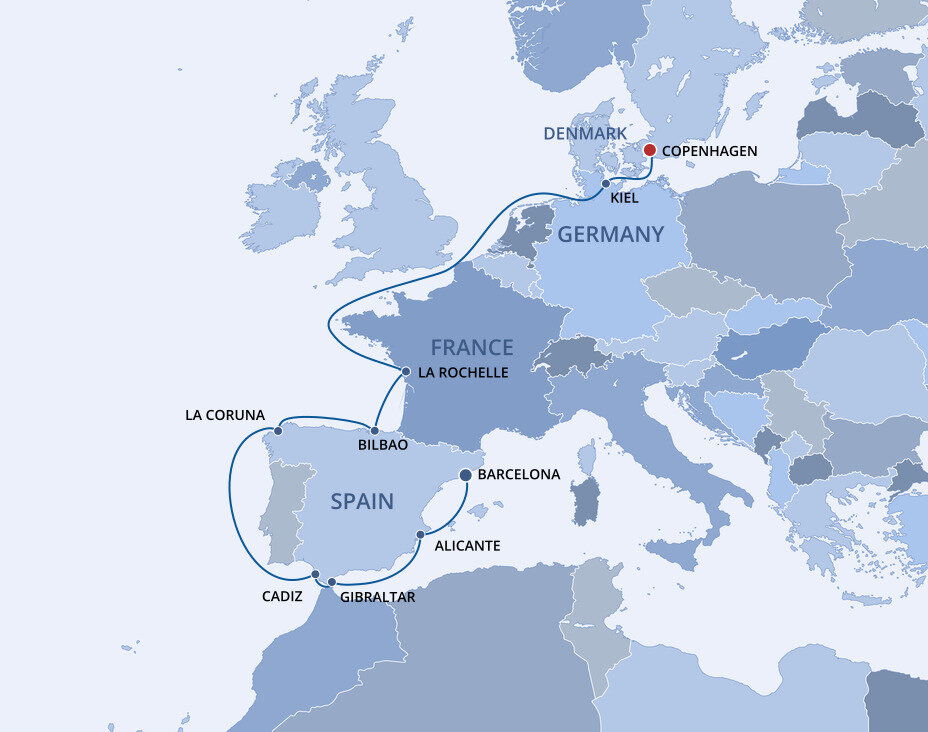 Surrounded by green mountains and lined by the beautiful blue water of the Bay of Biscay, Bilbao is magnificent mix of historic and spectacular modern architecture. Famed for its Guggenheim Museum, clad in glimmering titanium, this enormous structure is a work of art itself. Ships will dock in Getxo, which is a 20 minute drive from Bilbao.