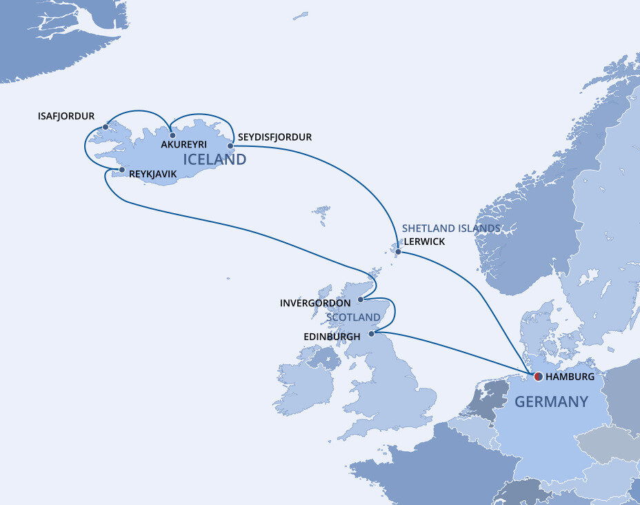 Iceland’s Capital of the North is the gateway to a thrilling land of roaring waterfalls, soaring volcanoes and glorious wildlife. Situated at the head of Eyjafjordur, Iceland's longest fjord and with a backdrop of dramatic snow-covered mountains, Akureyri is Iceland's second largest city. Ships will dock at the pier.