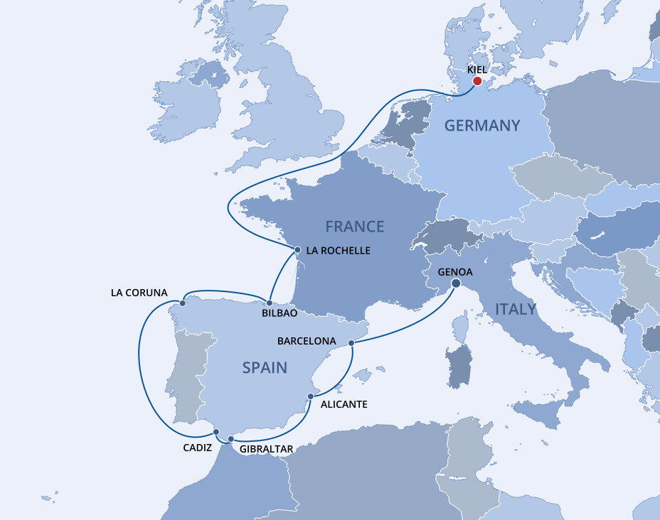 Surrounded by green mountains and lined by the beautiful blue water of the Bay of Biscay, Bilbao is magnificent mix of historic and spectacular modern architecture. Famed for its Guggenheim Museum, clad in glimmering titanium, this enormous structure is a work of art itself. Ships will dock in Getxo, which is a 20 minute drive from Bilbao.