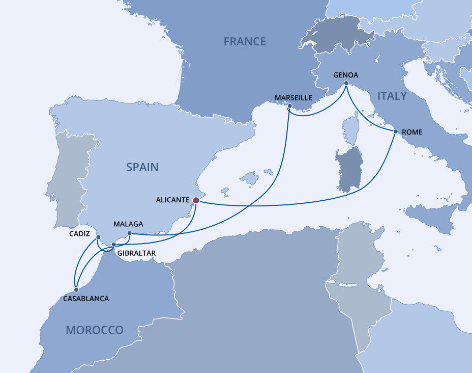 Located on the Costa Blanca, Alicante exudes a rare beauty. Lovely Baroque buildings cluster around the historic central district, while marble plazas grace its broad waterfront boulevard and pristine beaches like San Juan hug the shoreline. Ships will dock at the Port of Alicante cruise terminal.