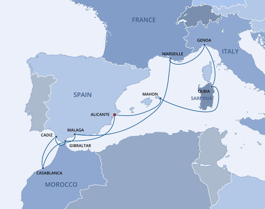 Located on the Costa Blanca, Alicante exudes a rare beauty. Lovely Baroque buildings cluster around the historic central district, while marble plazas grace its broad waterfront boulevard and pristine beaches like San Juan hug the shoreline. Ships will dock at the Port of Alicante cruise terminal.