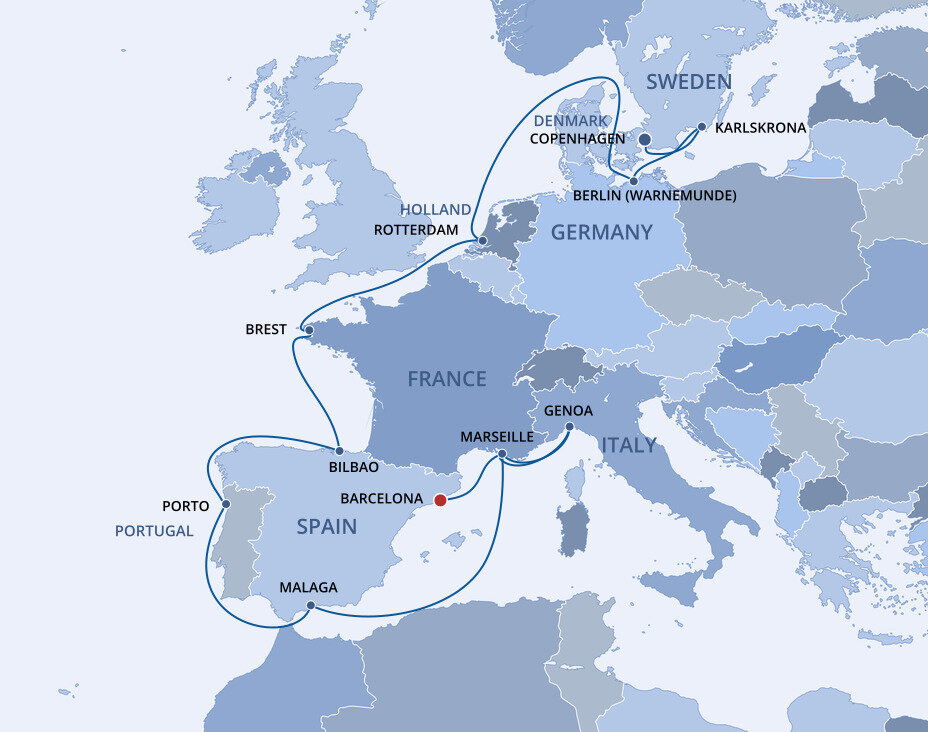 Your cruise finishes today in Barcelona, a captivating city on Spain's northeastern coast. If you're extending your stay in the city, start with a visit to La Sagrada Família, Antoni Gaudí's masterpiece, then wander through the narrow, historic streets of the Gothic Quarter.