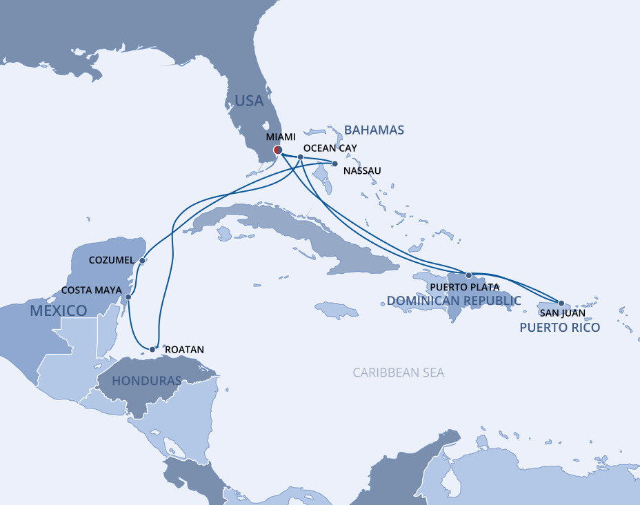This multicultural city where the sun rules supreme is more than just a cruise port. Visitors from all over the world enjoy Miami’s famous Art Deco buildings, family-friendly zoos and romantic palm tree-lined streets filled with fantastic restaurants. Don’t forget about the white sandy beaches and year-round warm weather, perfect for relaxing before or after your Caribbean cruise from Miami.