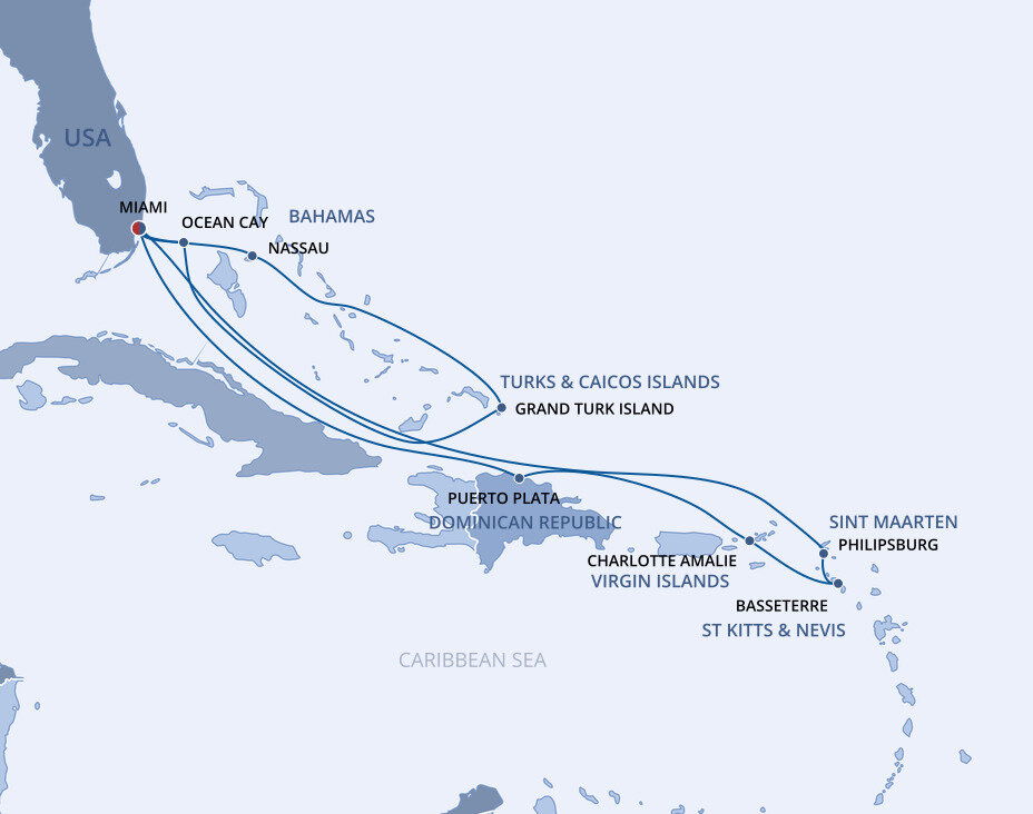 This multicultural city where the sun rules supreme is more than just a cruise port. Visitors from all over the world enjoy Miami’s famous Art Deco buildings, family-friendly zoos and romantic palm tree-lined streets filled with fantastic restaurants. Don’t forget about the white sandy beaches and year-round warm weather, perfect for relaxing before or after your Caribbean cruise from Miami.