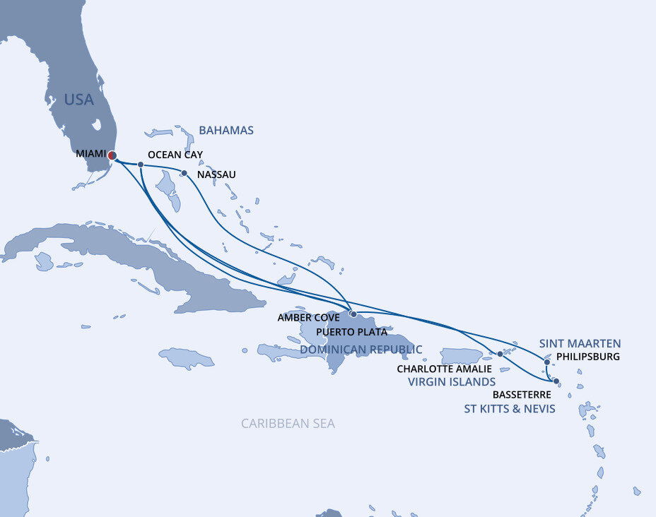 This multicultural city where the sun rules supreme is more than just a cruise port. Visitors from all over the world enjoy Miami’s famous Art Deco buildings, family-friendly zoos and romantic palm tree-lined streets filled with fantastic restaurants. Don’t forget about the white sandy beaches and year-round warm weather, perfect for relaxing before or after your Caribbean cruise from Miami.