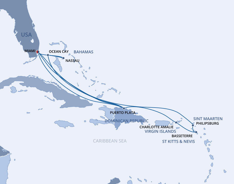 This multicultural city where the sun rules supreme is more than just a cruise port. Visitors from all over the world enjoy Miami’s famous Art Deco buildings, family-friendly zoos and romantic palm tree-lined streets filled with fantastic restaurants. Don’t forget about the white sandy beaches and year-round warm weather, perfect for relaxing before or after your Caribbean cruise from Miami.