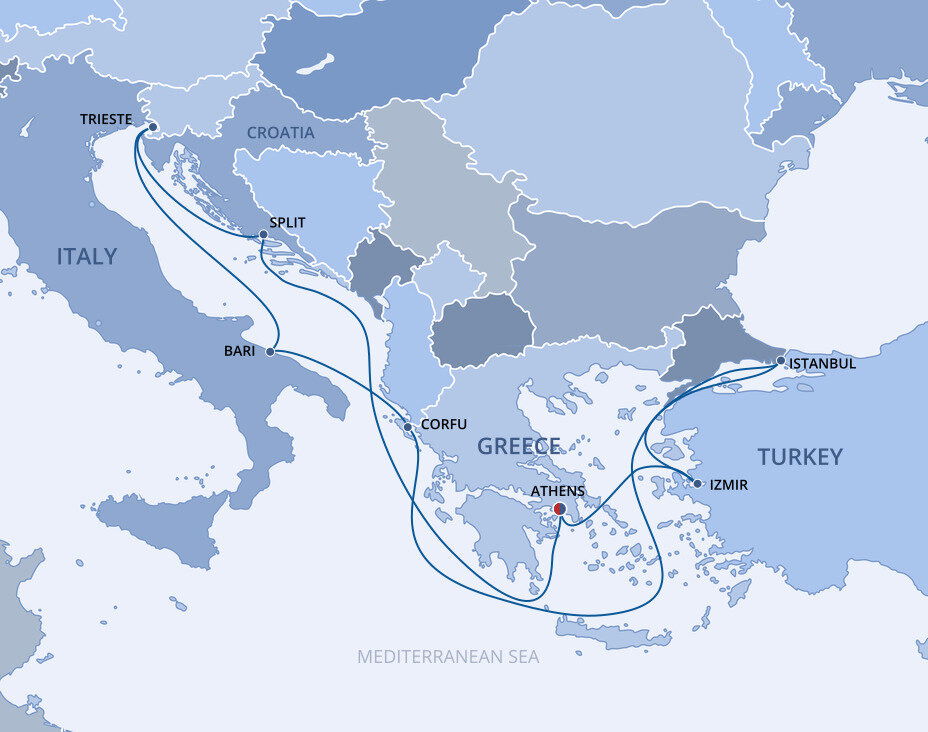The lush and verdant island of Corfu lies in the Ionian Sea, midway between Greece and Italy. It is an island of sparkling beaches, mountains splashed with wildflowers, and historical, perched fortresses. Ships will dock at the town of Corfu.