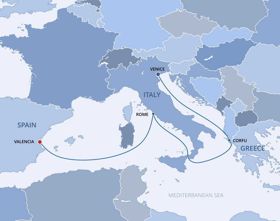 The lush and verdant island of Corfu lies in the Ionian Sea, midway between Greece and Italy. It is an island of sparkling beaches, mountains splashed with wildflowers, and historical, perched fortresses. Ships will dock at the town of Corfu.