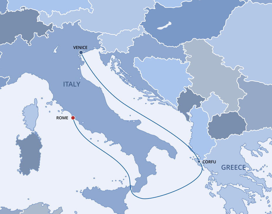 The lush and verdant island of Corfu lies in the Ionian Sea, midway between Greece and Italy. It is an island of sparkling beaches, mountains splashed with wildflowers, and historical, perched fortresses. Ships will dock at the town of Corfu.