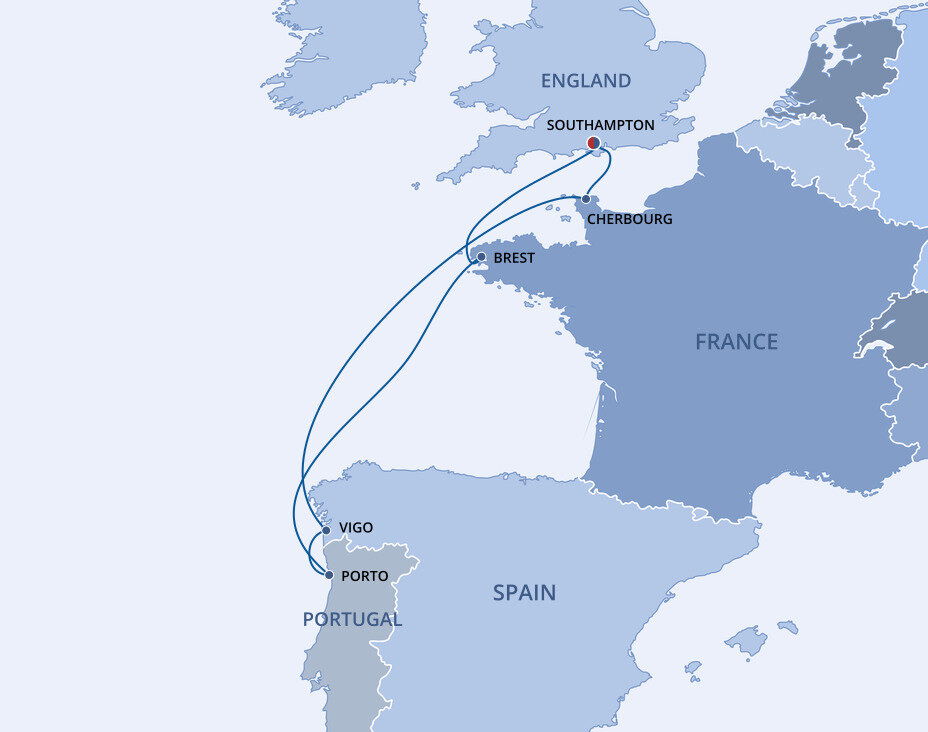 At the mouth of the Rio Douro lies Porto (or Oporto), a city famed for its production of Port, which is still stored and matured in the vast cellars that stretch along the banks of the river. The cities skyline is composed of sky-high bell towers, opulent baroque churches, and majestic beaux art buildings. Ships will dock at the Port of Leixoes.