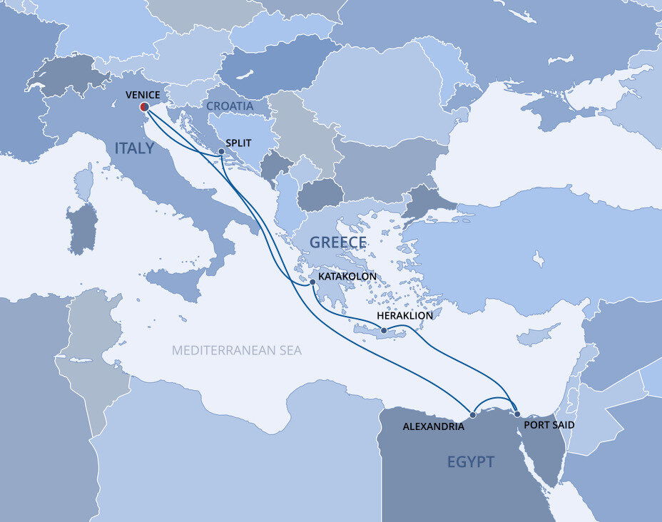 Cruise ships dock at the Alexandria Port, located about 220 kilometers (137 miles) from Cairo and only about 10 kilometers (6 miles) from Alexandria's city center. Alexandria itself is worth exploring, with attractions like the Catacombs of Kom El Shoqafa, the Bibliotheca Alexandrina, and the ancient Roman Amphitheatre. Many visitors enjoy walking along the Corniche, a waterfront promenade with views of the Mediterranean Sea. Be sure to explore the vibrant markets and sample local cuisine during your visit.
