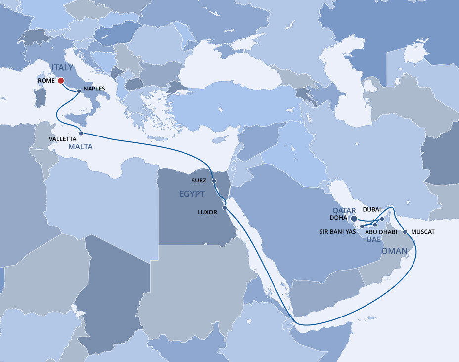 Enjoy the breathtaking illusion of sailing through oceans of desert sand as you cruise the Suez Canal, the engineering marvel that connects the Mediterranean and Red Seas.