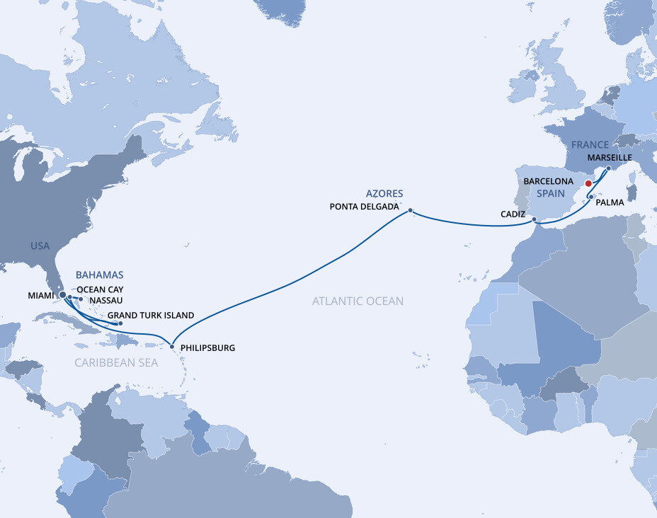 Your cruise finishes today in Barcelona, a captivating city on Spain's northeastern coast. If you're extending your stay in the city, start with a visit to La Sagrada Família, Antoni Gaudí's masterpiece, then wander through the narrow, historic streets of the Gothic Quarter.