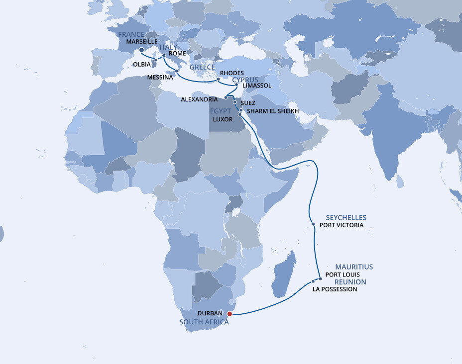 British colonial architecture prevails in Durban, yet natural beauty is what characterises this charming city on the Indian Ocean. Durban delights the traveller with its colourful mosaic of ethnic neighbourhoods and memorable excursions to game reserves and the traditional lifestyle of the Zulu people. Ships will dock at the N-Shed Passenger Terminal.