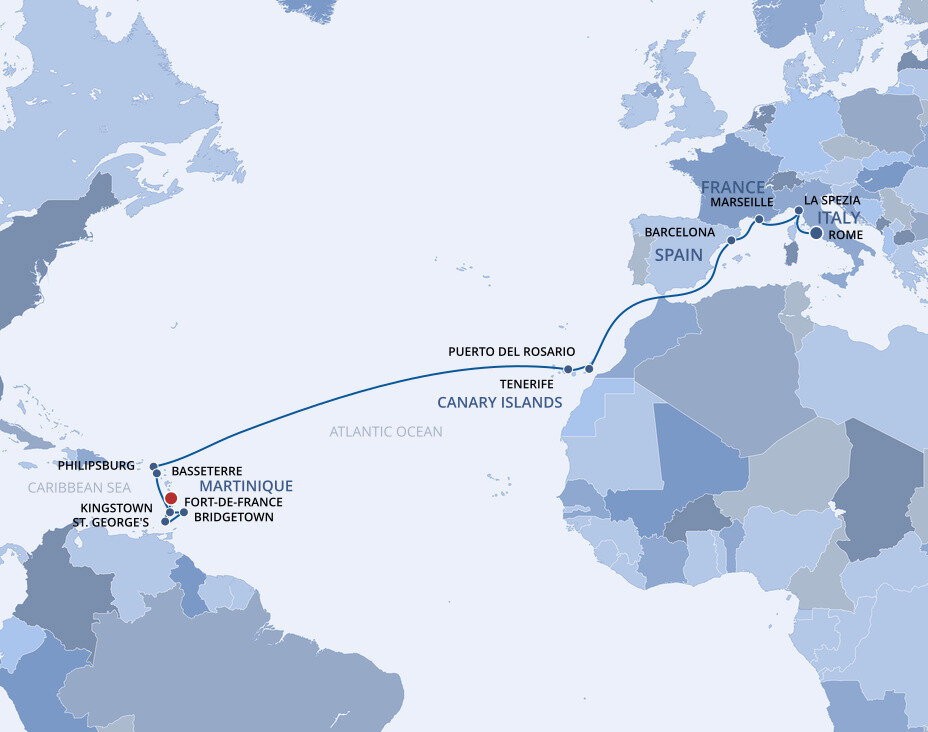Fort-de-France, located on Martinique is the largest city in the French West Indies and it has personality to match. Life here is vibrant and fast-paced, and the culture is as colourful as the brightly painted shops that line the city’s cobblestone streets. Ships will dock at the port.