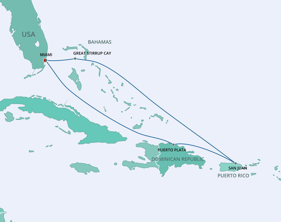 Nestled in the Bahama’s Berry Island chain is a 250-acre uninhabited paradise waiting for you. Great Stirrup Cay is a private retreat designed specifically for cruise guests enjoyment. Ships will anchor offshore and tenders will be provided to the shore.