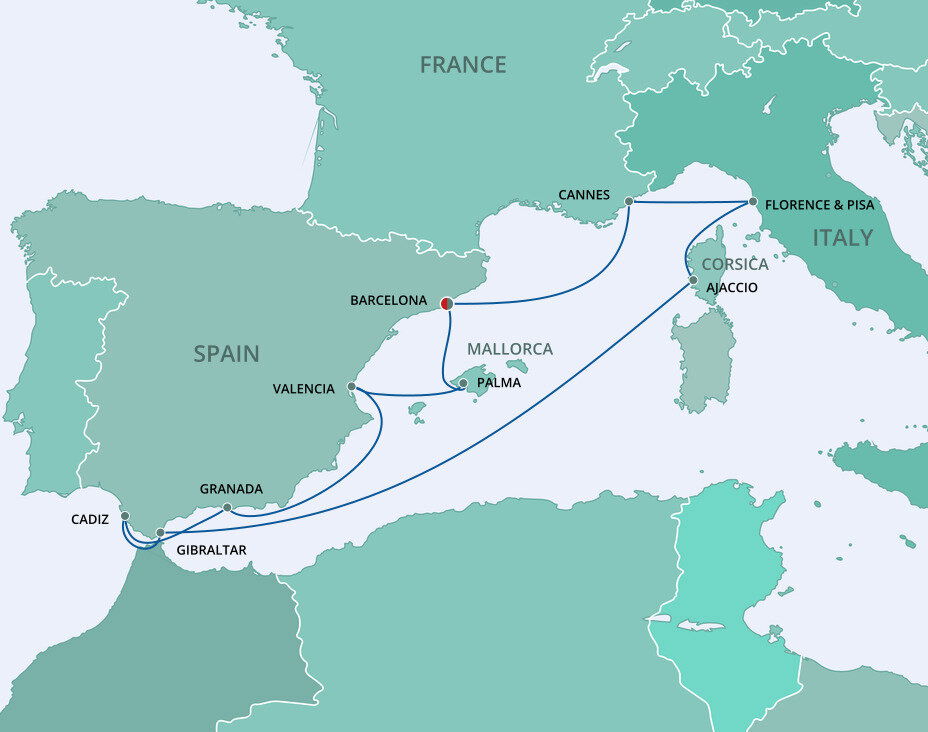 Your cruise finishes today in Barcelona, a captivating city on Spain's northeastern coast. If you're extending your stay in the city, start with a visit to La Sagrada Família, Antoni Gaudí's masterpiece, then wander through the narrow, historic streets of the Gothic Quarter.