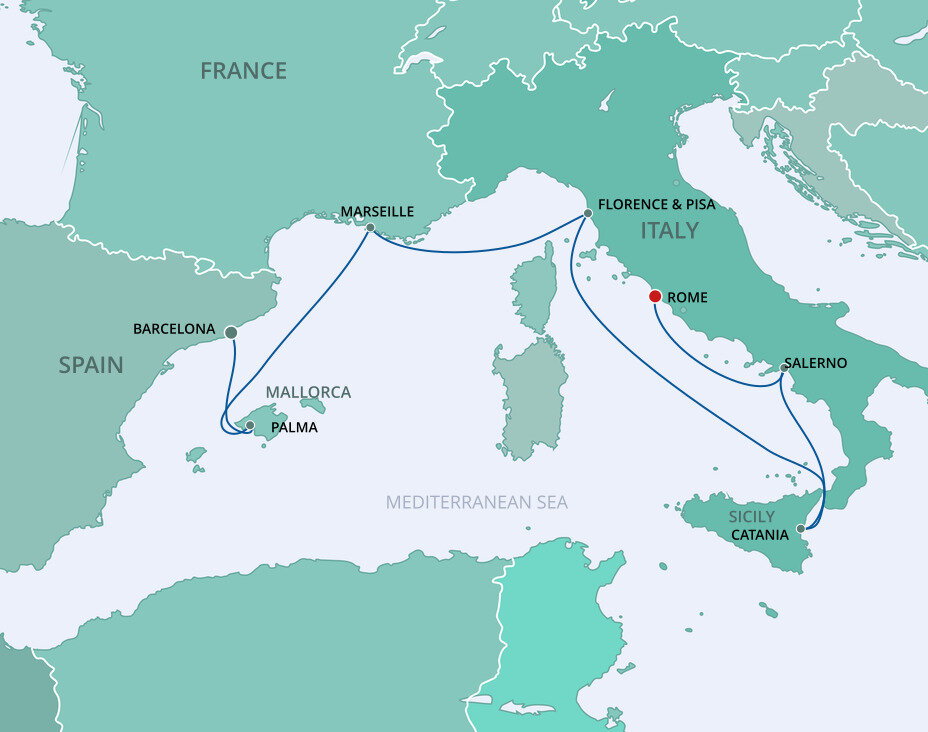 The lively seaport of Salerno is a thriving modern metropolis with ancient origins. Its elegant lungomare, a shoreside promenade, offers far-reaching views of the sea and the mountains beyond. The city boasts an ideal location with both the ruins of Roman cities and the stunning Amalfi Coast in easy reach. Ships will dock at this port.