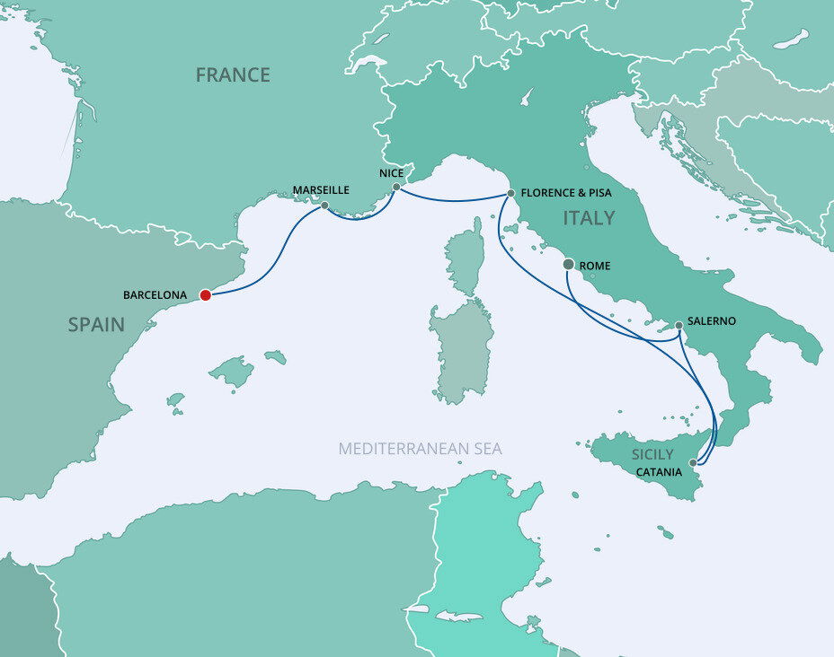 Your cruise finishes today in Barcelona, a captivating city on Spain's northeastern coast. If you're extending your stay in the city, start with a visit to La Sagrada Família, Antoni Gaudí's masterpiece, then wander through the narrow, historic streets of the Gothic Quarter.