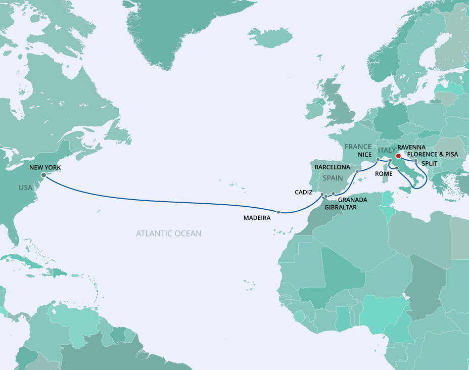 Ravenna, “The Mosaic City”, is best known for its churches which date back 1,500 years and are decorated with stunning Byzantine mosaics. If you're not staying in Ravenna at the end of your cruise, Bologna it's approximately 85 kms (53 miles) away, and Venice is approximately 140 kms (87 miles) away - a journey that takes about 2 hours by train.