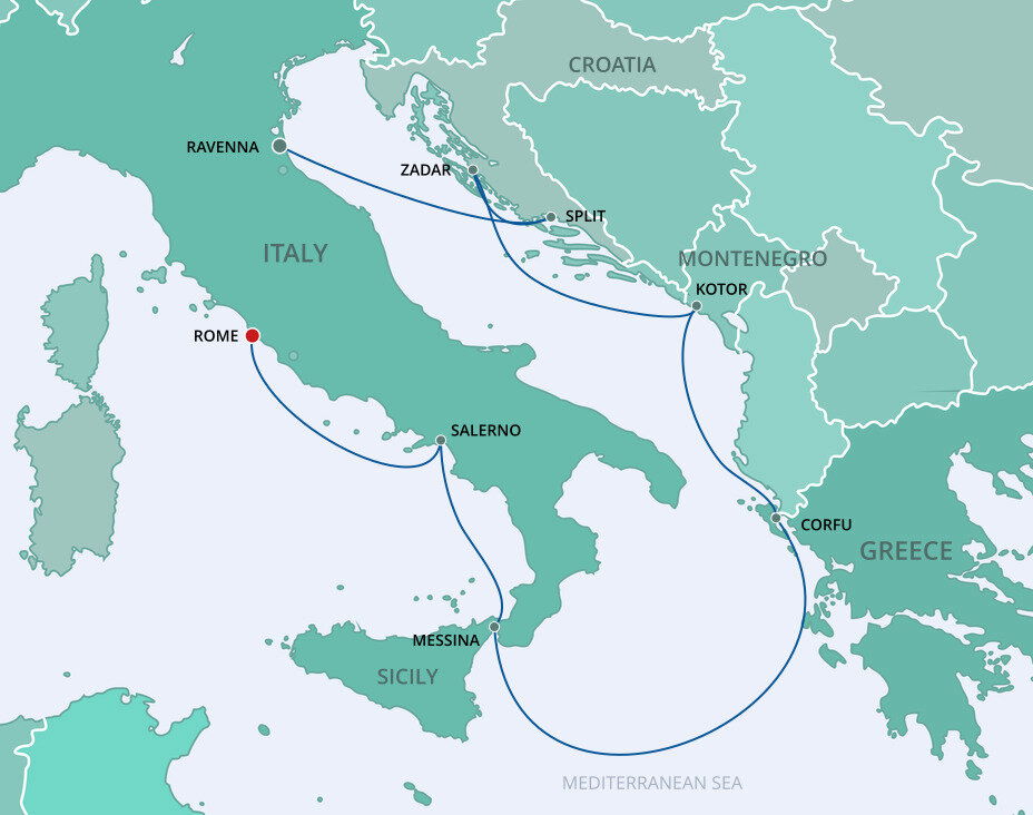 The lush and verdant island of Corfu lies in the Ionian Sea, midway between Greece and Italy. It is an island of sparkling beaches, mountains splashed with wildflowers, and historical, perched fortresses. Ships will dock at the town of Corfu.