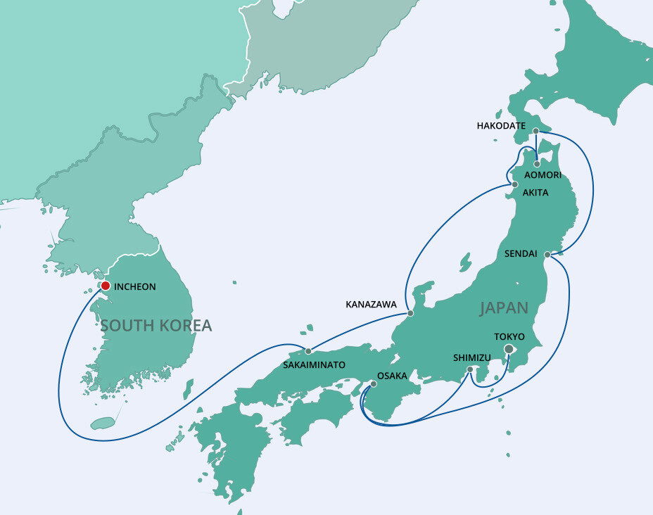Honshu's northernmost city is full of picturesque historic temples, museums, and close to incredible nature like Mt. Hakkoda. In the spring and summer, Aomori bursts to life with cherry blossom festivals and the fiery Nebuta Festival every August. Ships dock at the Shin-Chuo wharf.
